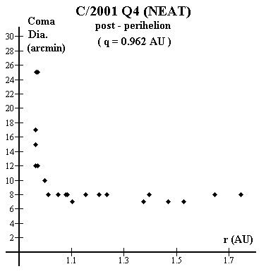 El máximo diámetro angular de coma observado para el C/2001 Q4 fue de 25' ( minutos de arco ) en binoculares 7x50 el día 8 de Mayo ( 30' estimados a simple vista ), en los días de mayor cercanía del cometa a la Tierra ( d = 0.32 UA ), a una distancia del Sol ( r ) de 0.97 UA, poco antes del perihelio ( 15 de Mayo ). En cifras absolutas, los 25' observados el 8 y 11 de Mayo corresponden a un diámetro aproximado de coma entre 350.000 y 400.000 km.