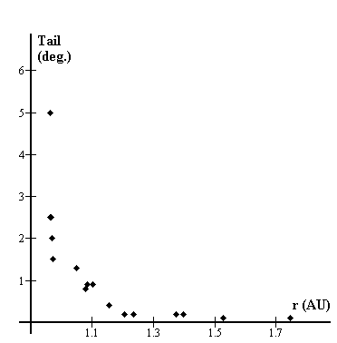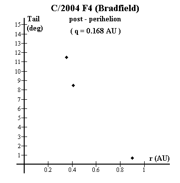 En lo que respecta a la cola, sin embargo, la mayor longitud observada correspondió a los días del perihelio, 5º de cola el 14 de Mayo en binoculares 7x50 ( 2.5º a simple vista ), para luego menguar rápidamente y estabilizarse en 0.2º - 0.1º ( binoculares 25x100 ) en Julio - Agosto. En cifras absolutas, los 5º corresponden a una longitud aproximada de cola de 6 millones de kilómetros.