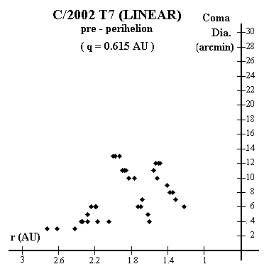 En la gráfica del C/2002 T7 se muestra el tramo pre-perihelio mejor observado, hasta el 1 de Marzo. El diámetro de coma fue de 0.5' en la primera estimación, no representada en la gráfica ( magnitud 12.9 con telescopio, 27 de Agosto de 2003 ), a distancia heliocéntrica r = 3.7 UA. El 17 de Noviembre pudo observarse por primera vez con binoculares 25x100 ( m1 = 10.1, Dia. = 3' ).