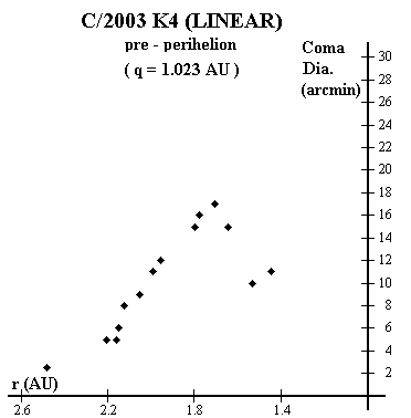 La primera observación del C/2003 K4 que pudo realizarse fue el 17 de Febrero, no representada en la gráfica ( magnitud 12.7 con telescopio ), a distancia geocéntrica d = 4.2 UA y heliocéntrica 3.5 UA, estimando un diámetro de coma de 0.5'. Aprovechando los periodos de observación favorables, sin interferencia lunar, pudo verse en buenas condiciones el incremento del diámetro de coma, alcanzando los 17' a mediados de Julio, poco después de su máxima aproximación a la Tierra ( d = 1.4 UA, r = 1.8 UA ), cuando el cometa llegó a verse a simple vista desde lugares suficientemente oscuros, con óptima posición casi zenital. A partir de entonces la coma observada fue disminuyendo hasta mediados de Agosto.
